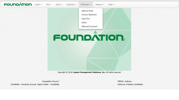 A continuación, vemos la pantalla de ingreso a los estados proforma usado por los simuladores de Capsim en su portafolio de simuladores: Foundation, Global DNA, etc. Como se puede apreciar en la gráfica, tienes entradas al balance general, declaración de ingreso, flujo de caja, ratios financieras y al balanced score card: