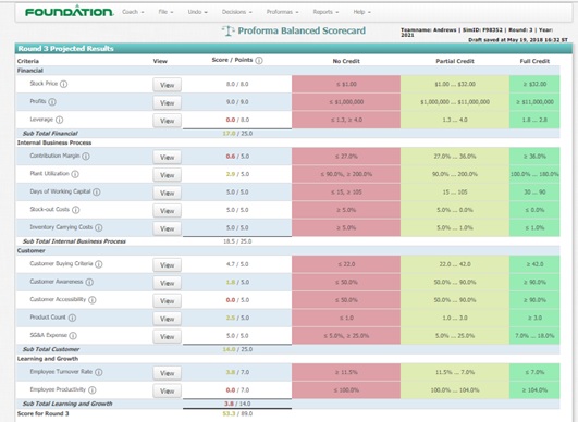 Los buenos simuladores de negocios además de proyectar los estados financieros instantáneamente, ya vienen con sistemas de indicadores para definir el score o puntaje final del juego, sistemas de indicadores tipo Balanced Score Card que le permiten a los estudiantes tener claridad sobre las relaciones causa efecto, entre los ítems de control y los indicadores de gestión o kpis, a continuación se puede apreciar un ejemplo del Balanced score card usado por los simuladores de Capsim en su portafolio de simuladores: Capstone, Foundation, Global DNA, etc. El cual es de un realismo impresionante: