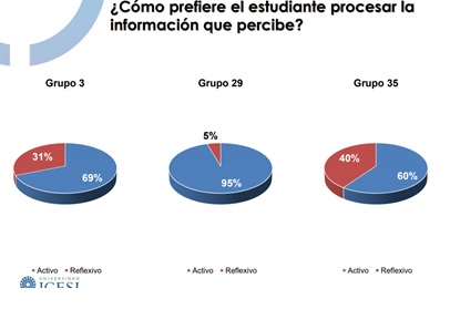 Siempre he considerado que en clase debemos hacer una mezcla de pedagogías y didácticas, lo que he llamado el pedagogic Mix, esta mezcla es buena porque nuestros estudiantes tienen distintos estilos de aprendizaje, distintas formas de aprender, así que cuando los mezclamos captamos mejor la atención de todos. En ICESI en Cali, donde soy profesor, todos los semestres nos entregan los estilos de aprendizaje de los chicos, por cada curso y en realidad ayuda mucho para diseñar la estrategia de enseñanza y acertar en ella. En la gráfica de abajo se aprecia una página de estos informes tan útiles: