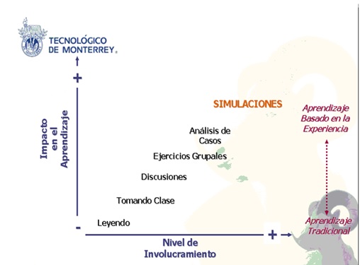 la metodología de casos es una metodología activa de enseñanza, al igual que los juegos de negocios y combinándolos son los mejores métodos para que los estudiantes comprendan conceptos y buenas prácticas empresariales como vemos en el grafica que sigue, del TEC de monterrey: